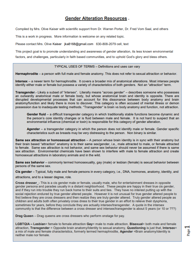 Misunderstandings so commonly held among especially older members of faith based communities become clearer with explanation of the actual medical and social dynamics. For many "cis" folks this requires significant time to process, pray, and adjust to the reality of the issues. Particularly some men have a very difficult time handling these situations (Trans phobia and homo phobia). To a point, we need to be patient with each other, yet we face a serious, too often immediate, crisis. Since endocrine disrupting chemicals came into common use back before the 1950's, not only our children and young people but older persons as well, everywhere, are affected, including in our churches, who are finally putting words and action to their lifelong dilemma (those who did not commit suicide already). It is vital that we grasp the concepts ahead of a time we may have need of them. Suicide and alienation is very common for gender altered people. That statistic is very much tied to social acceptance and support or rejection by family and friends.