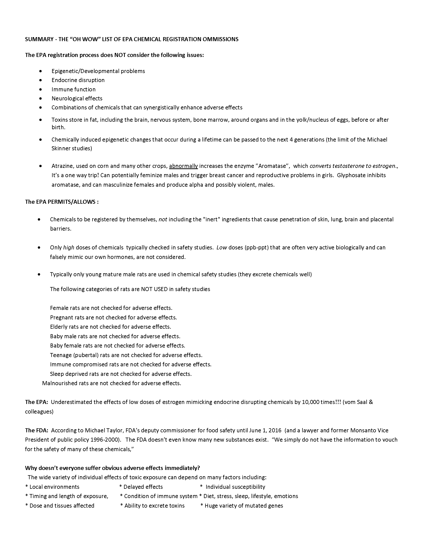 Below is a summary of Dr. Warren Porter's list of EPA Omissions in the Safety Registration Process